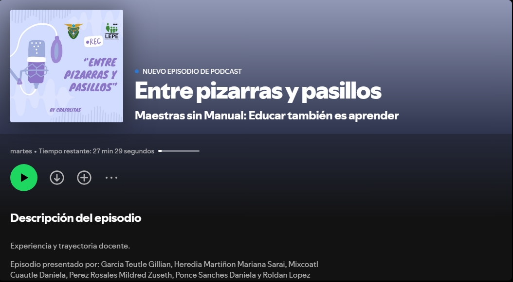 Para la Unidad de Aprendizaje III, participé junto con mi equipo en la creación de un podcast educativo, donde abordamos distintos temas relacionados con la docencia en preescolar. En particular, nuestro episodio se centró en una entrevista con la Mtra. Alejandra Domínguez Narváez, quien nos compartió su trayectoria profesional, así como la pasión que ha cultivado a lo largo de su camino como docente de educación preescolar.